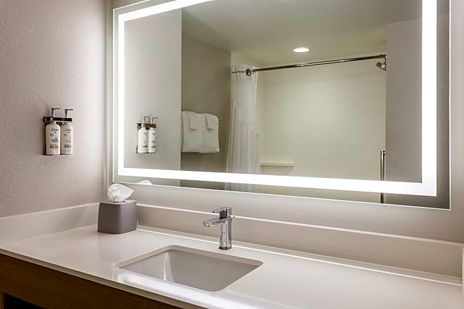 This suite features a cable TV, desk, and seating area. A microwave and refrigerator are included as well as an private bathroom with a hairdryer.